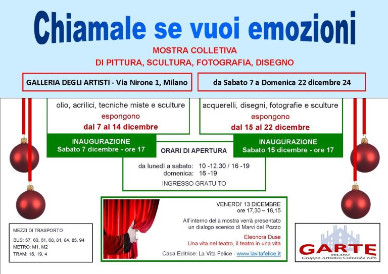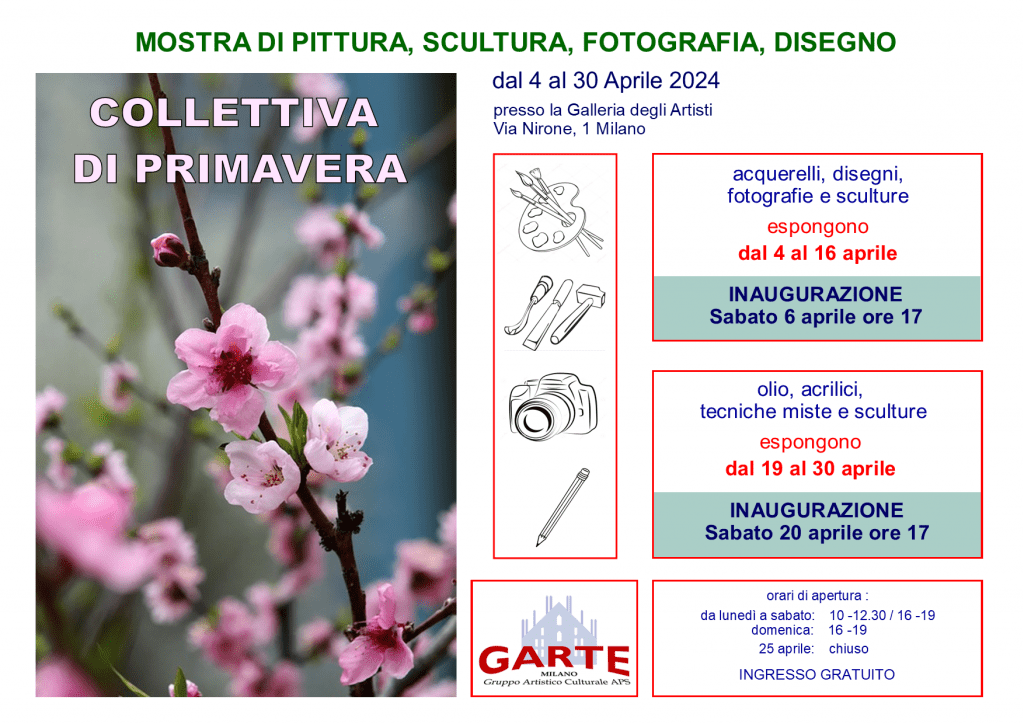 Un grande progetto di Garte. Un Concorso a livello nazionale che ha visto la fase finale negli spazi prestigiosi del Palazzo di Regione Lombardia che ha collaborato alla realizzazione dell’evento. Un notevole sforzo organizzativo e logistico premiato con un grande successo in termini di partecipazione e di qualità. 80 Artisti con un centinaio di opere di pittura, scultura e fotografia che sono confluite a Milano da tutta l’Italia e alcune anche dall’Estero. Un migliaio di visitatori che hanno garantito vitalità e commenti entusiastici per tutta la durata della Mostra dei finalisti. Quattro vincitori ai quali sono stati assegnati premi in buoni acquisto e che hanno acquisito il diritto di partecipare ad una successiva Mostra a Roma a loro riservata.